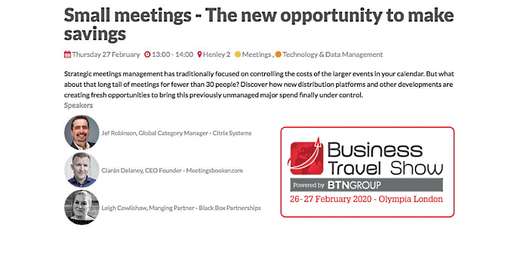Join our CEO @ciarandelaney at the @BTShowlondon presenting “Small meetings – The new opportunity to make savings” together with @LeighCowlishaw and Jef Robinson
